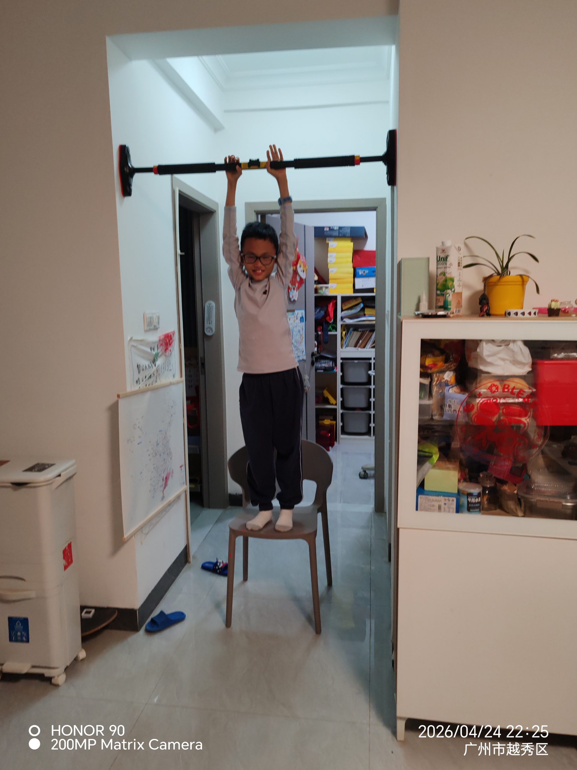 本来爸爸很久之前就买了个单杠的,不过用来吊着吊椅,很少用做单杠,这次爸爸又买了一个放过道给我锻炼。